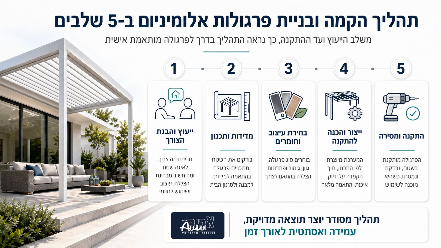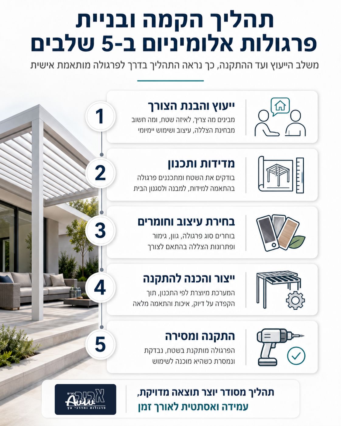 לאורך כל התהליך, חברת אביב פרגולה ידועה במוניטין שלה כמקפידה על ליווי אישי, תקשורת פתוחה עם הלקוח, ומידה בלוחות זמנים ובסטנדרטים גבוהים של איכות ומקצועיות.